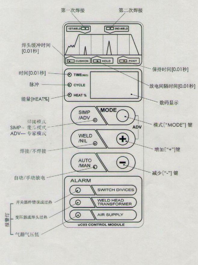 設(shè)置焊接能量HEAT%和周波數(shù)CYCLE,將將兩數(shù)值設(shè)置成最小。根據(jù)需要設(shè)置預(yù)熱波數(shù)。